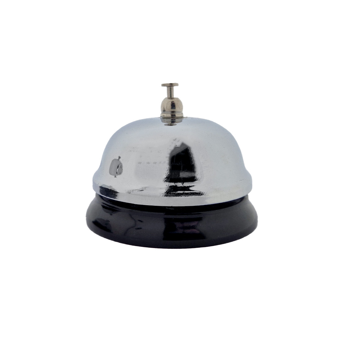 Deze verchroomde receptiebel staat op een zwart metalen sokkel en heeft een doorsnede van Ø60 mm. De bel is voorzien van een metalen hamer-klepel, waardoor hij een luid geluid maakt wanneer je erop drukt.