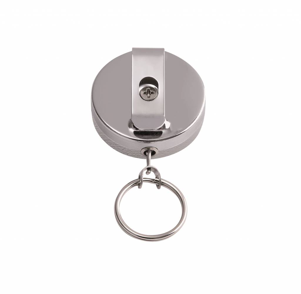 Rollmatic mooie afgewerkte zwarte titaan look en een glanzend verchroomde achterzijde met clipsluiting voor aan een riem. Doorsnede 50 mm en voorzien van een 100 cm lang nylon koord