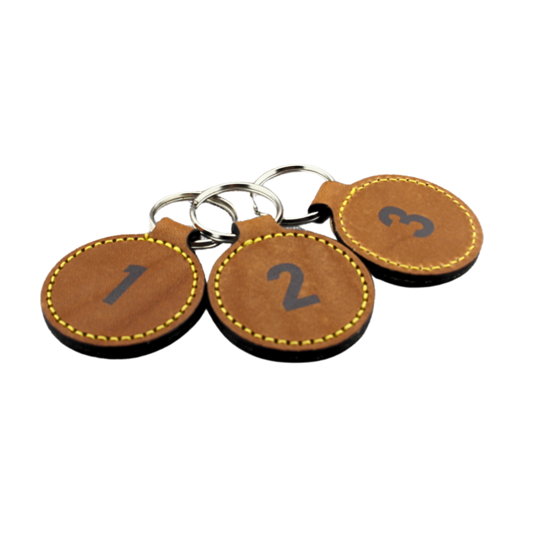 Bij grotere aantallen leren sleutelhangers kunnen we betaalbaar een brandlogo op de sleutelhanger aanbrengen, maar als je slechts enkele sleutelhangers nodig hebt, dan is dat niet mogelijk. Als je op een leren of kunstlederen sleutelhangers verschillende teksten of nummeringen aan wil brengen dan is een branding op de sleutelhanger ook niet mogelijk. Bij wisselende teksten, logo's of nummers op een sleutelhanger, dan kunnen we die aanbrengen middels een zwarte print op de leren sleutelhanger.