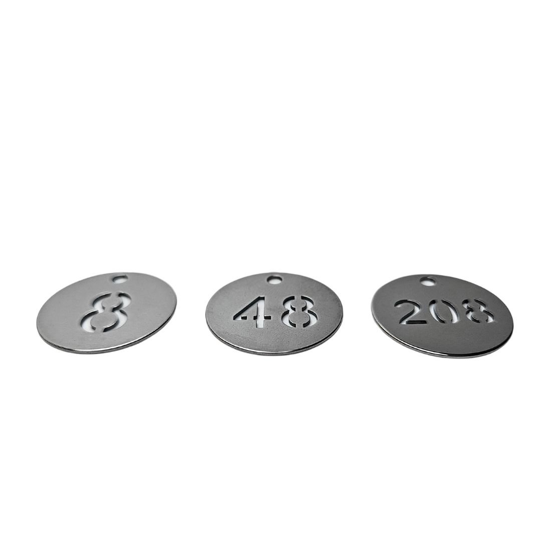De nummerplaatjes hebben een diameter van 30 mm en een dikte van 1 mm. Het sterke materiaal is bestand tegen roest en blijft lang mooi. Je kunt kiezen uit sets met verschillende nummerreeksen zoals 1 t/m 100, 1 t/m 250, en 1 t/m 500. Tip: lees onze blog over waarom RVS toch kan roesten, voor informatie en tips over het mooi houden van RVS.