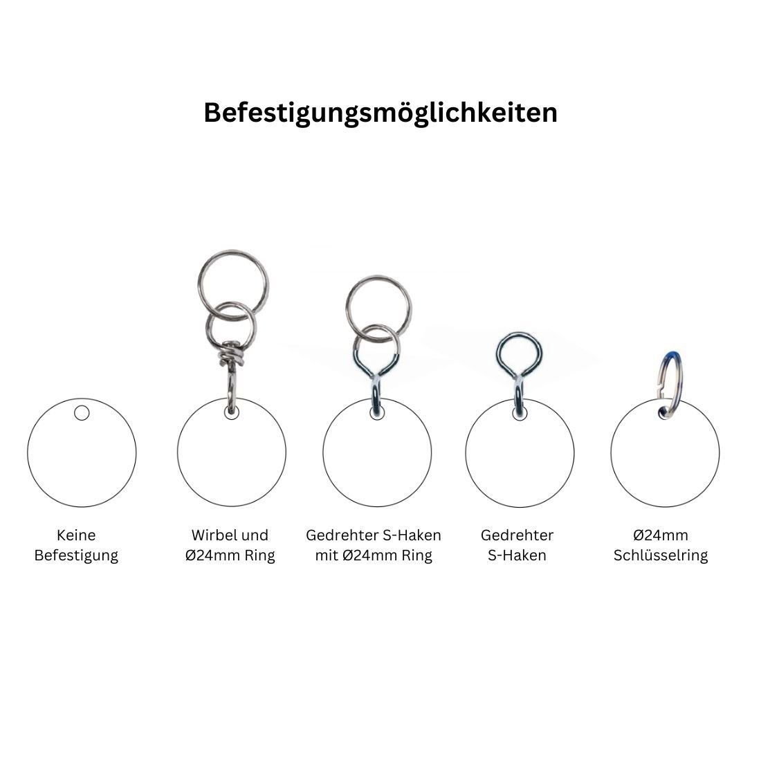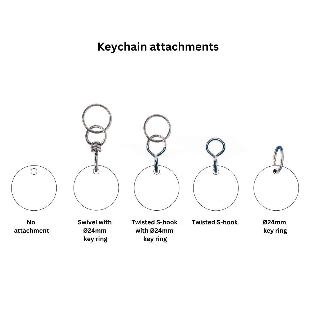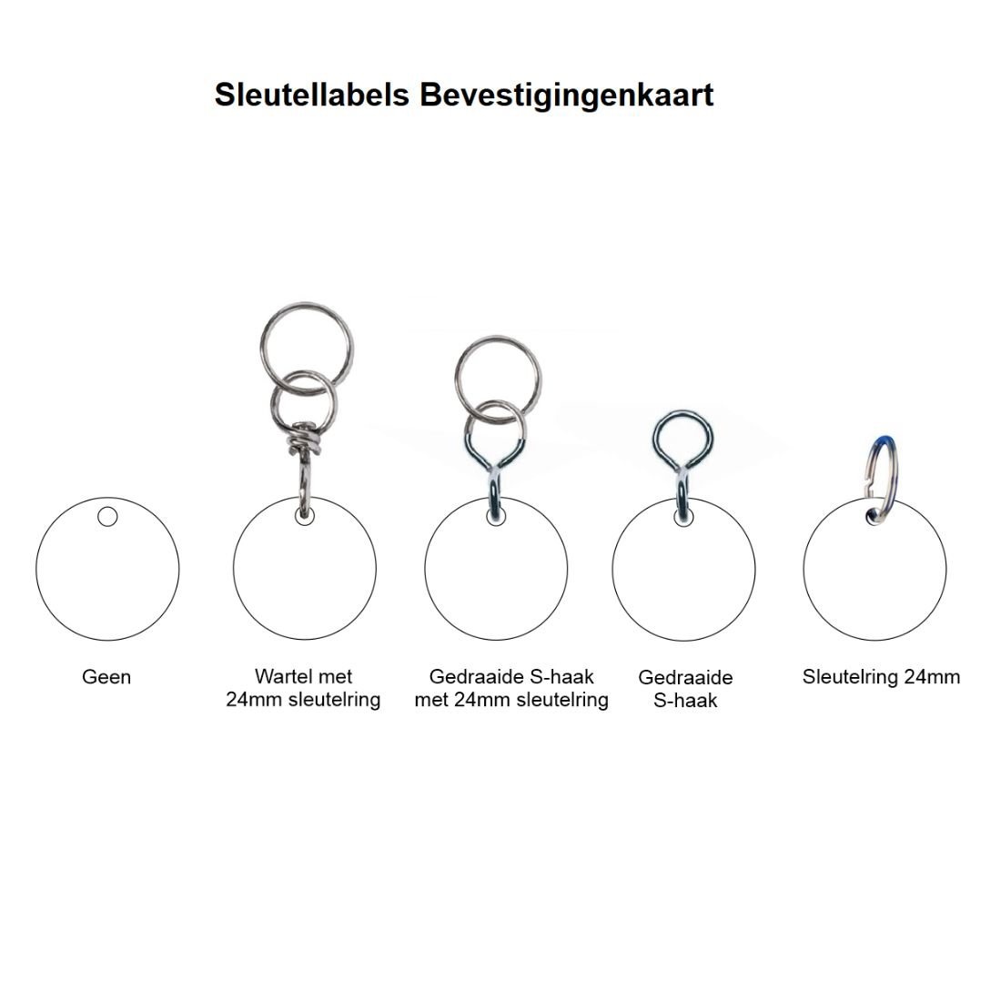 Het ronde sleutellabeltje heeft een doorsnede van 30 mm en een dikte van 1 mm. De sleutellabel kan voorzien worden van jouw logo door middel van zwarte gravering. Voor de afwerking kun je kiezen uit diverse zilverkleurige bevestigingen. Deze worden standaard los geleverd of tegen een kleine meerprijs gemonteerd. De sleutelhanger is gemaakt van roestvrij staal, wat betekent dat deze bestand is tegen corrosie. Tip: lees onze blog over waarom RVS toch kan roesten, voor informatie en tips over het mooi houden van RVS.