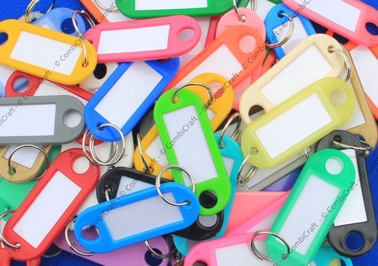 De sleutelhangers worden naar keuze afgewerkt met een staaldraadring met éénderde overlap of met een S-Haak.