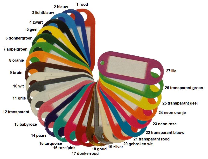 De papieren sleutellabels zijn per 2500 stuks te bestellen, waarbij je per kleur minimaal 250 labels dient te bestellen. Keuze is uit 20 kleuren. Als je 1 kleur aanvinkt krijg je 2500 sleutelhangers in 1 kleur, vink je 2 kleuren aan dan ontvang je 1250 sleutelhangers per kleur etc.