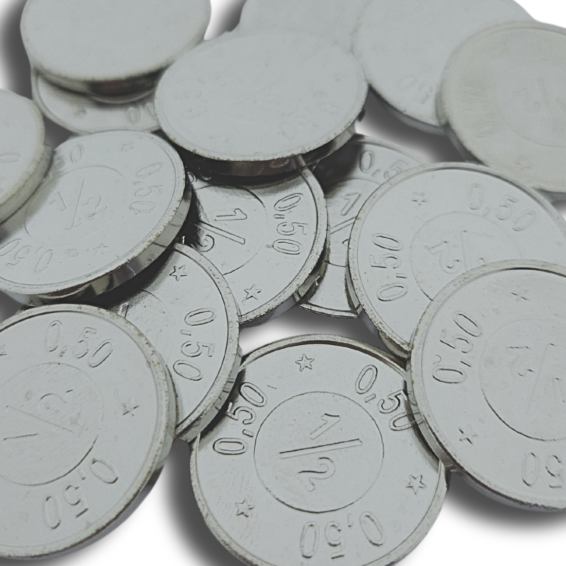 De munt is gemaakt van staal en heeft een diameter van 24,25 mm, gelijk aan een reguliere €0,50 munt. Aan beide zijden staat in het midden het cijfer ½, met daaromheen 0,50. Zo is direct duidelijk dat het om een munt van 50 cent gaat. De munten worden verkocht per 100 stuks. Liever eerst even testen? Bestel hier je €0,50 testmunt.
