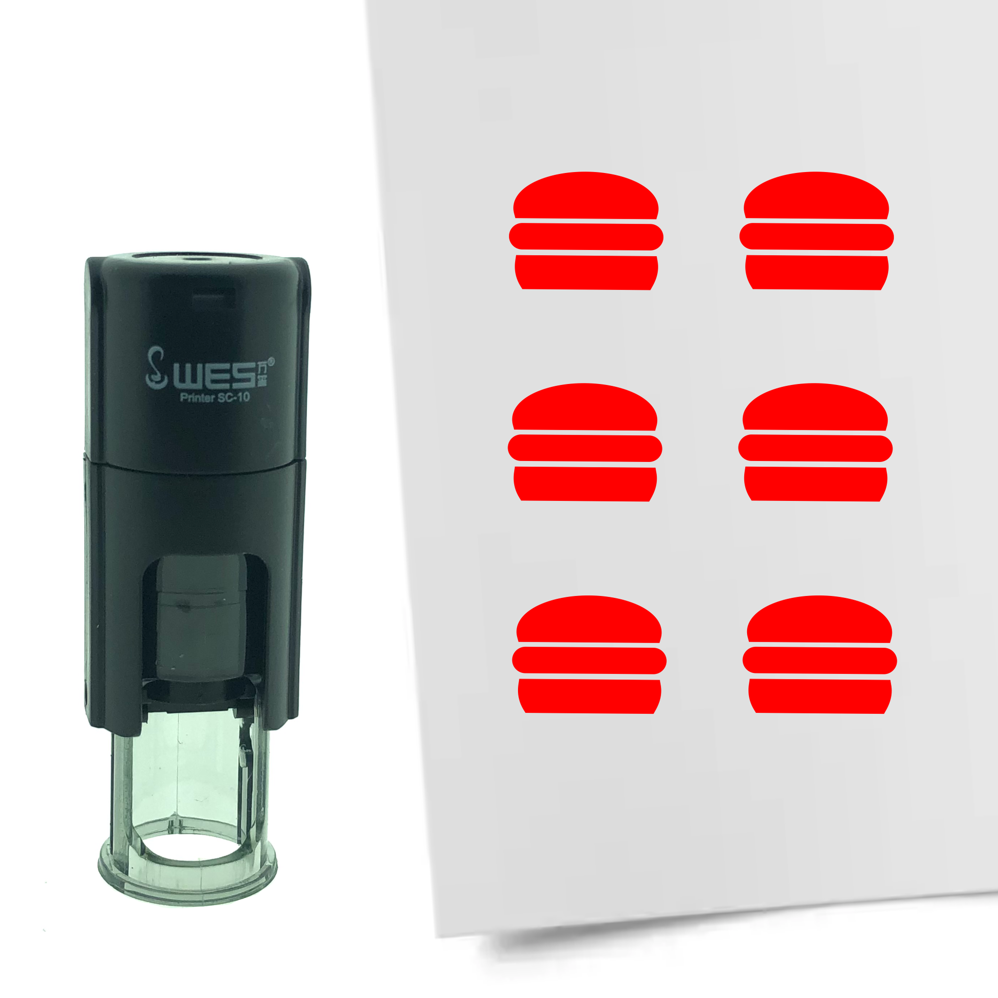 Stempel of stempeltje van 1cm rond in de vorm van een hamburger. Stempel kan gebruikt worden voor stempelen van spaarkaarten of stempelkaarten. Stempel bevat een inktkussen dus geen extern inktkussen nodig.