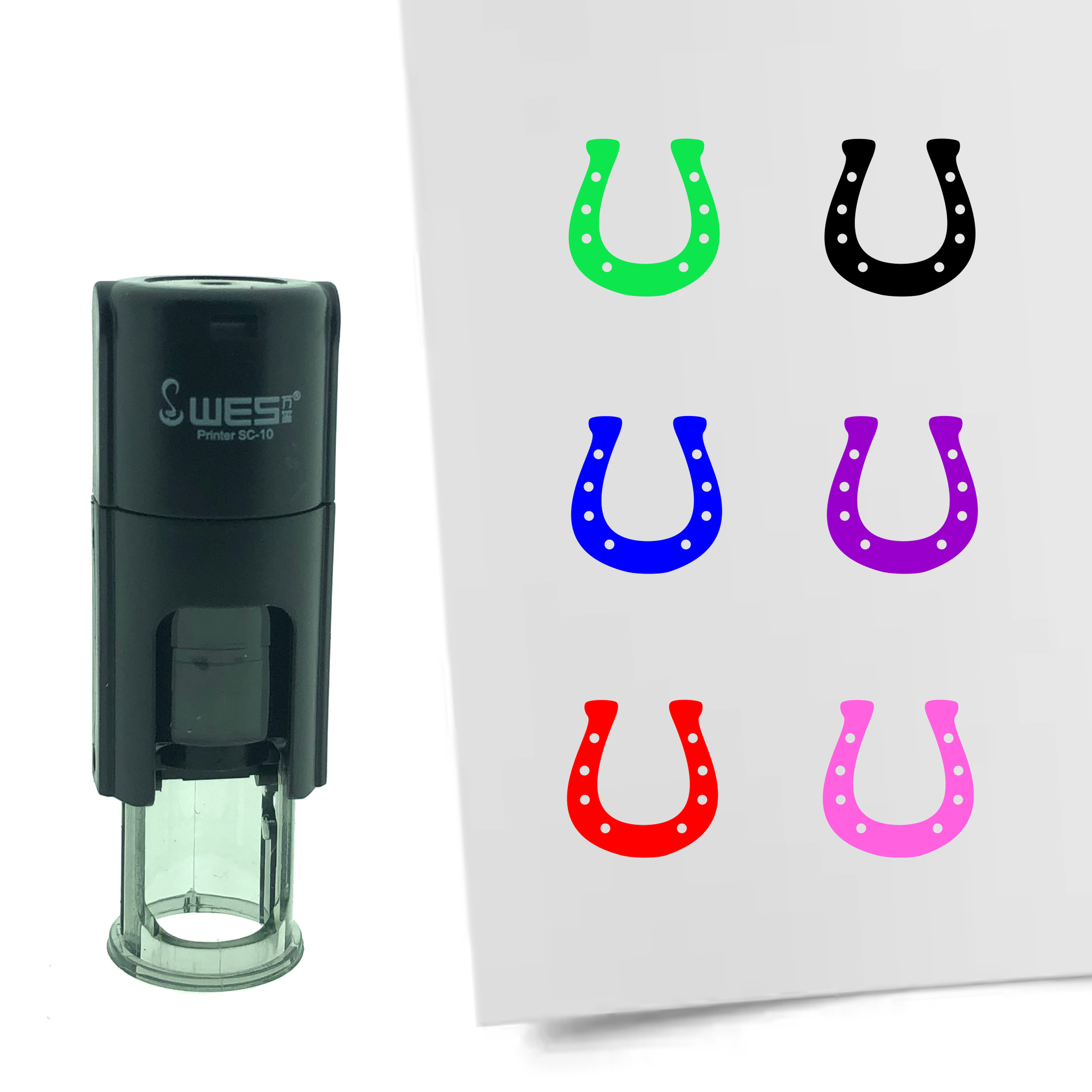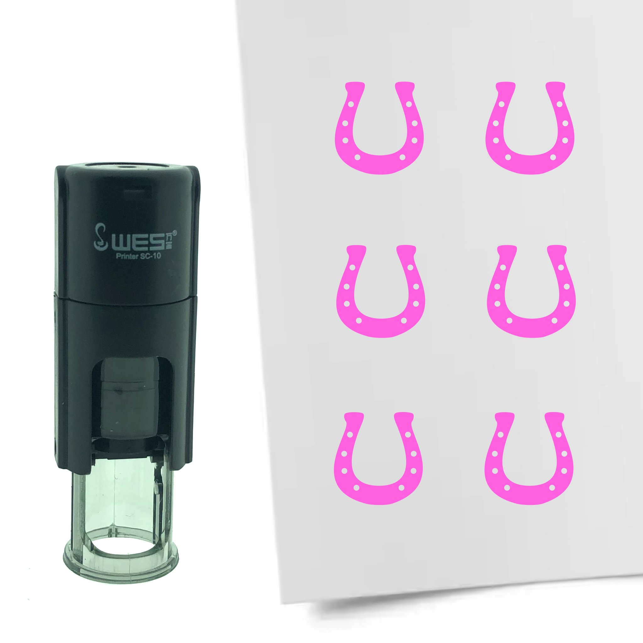 Stempel of stempeltje van 1cm rond in de vorm van een hoefijzer. Stempel kan gebruikt worden voor stempelen van spaarkaarten of stempelkaarten. Stempel bevat een inktkussen dus geen extern inktkussen nodig.