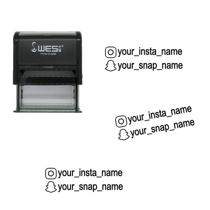Gepersonaliseerde Snapchat en Instagram stempel met jouw eigen gebruikersnamen! Beide regels worden gegraveerd met eerst het insta en snapchat symbool en daarna jouw gebruikersnaam. De stempel heeft een drukvlak van ca 27x10mm. De stempel heeft een intern stempelkussen, je hebt dus verder geen extern inktkussen meer nodig. Kleur van de afdruk is zwart.