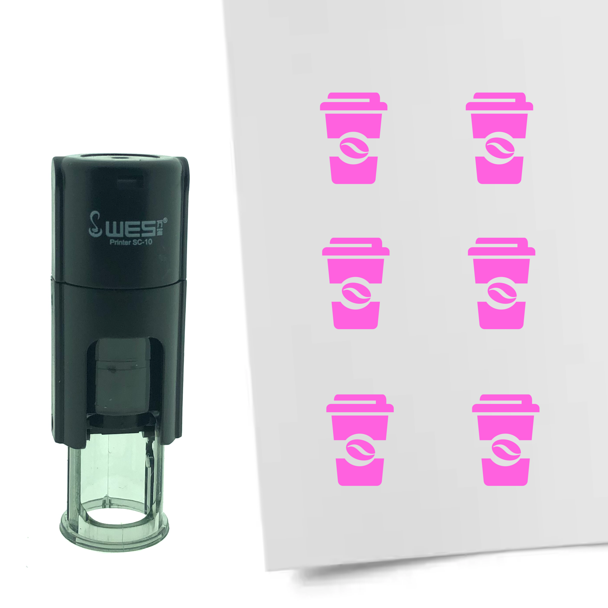 Stempel of stempeltje van 1cm rond in de vorm van een coffee-to-go beker of gewone koffie. Stempel kan gebruikt worden voor stempelen van spaarkaarten of stempelkaarten. Stempel bevat een inktkussen dus geen extern inktkussen nodig.