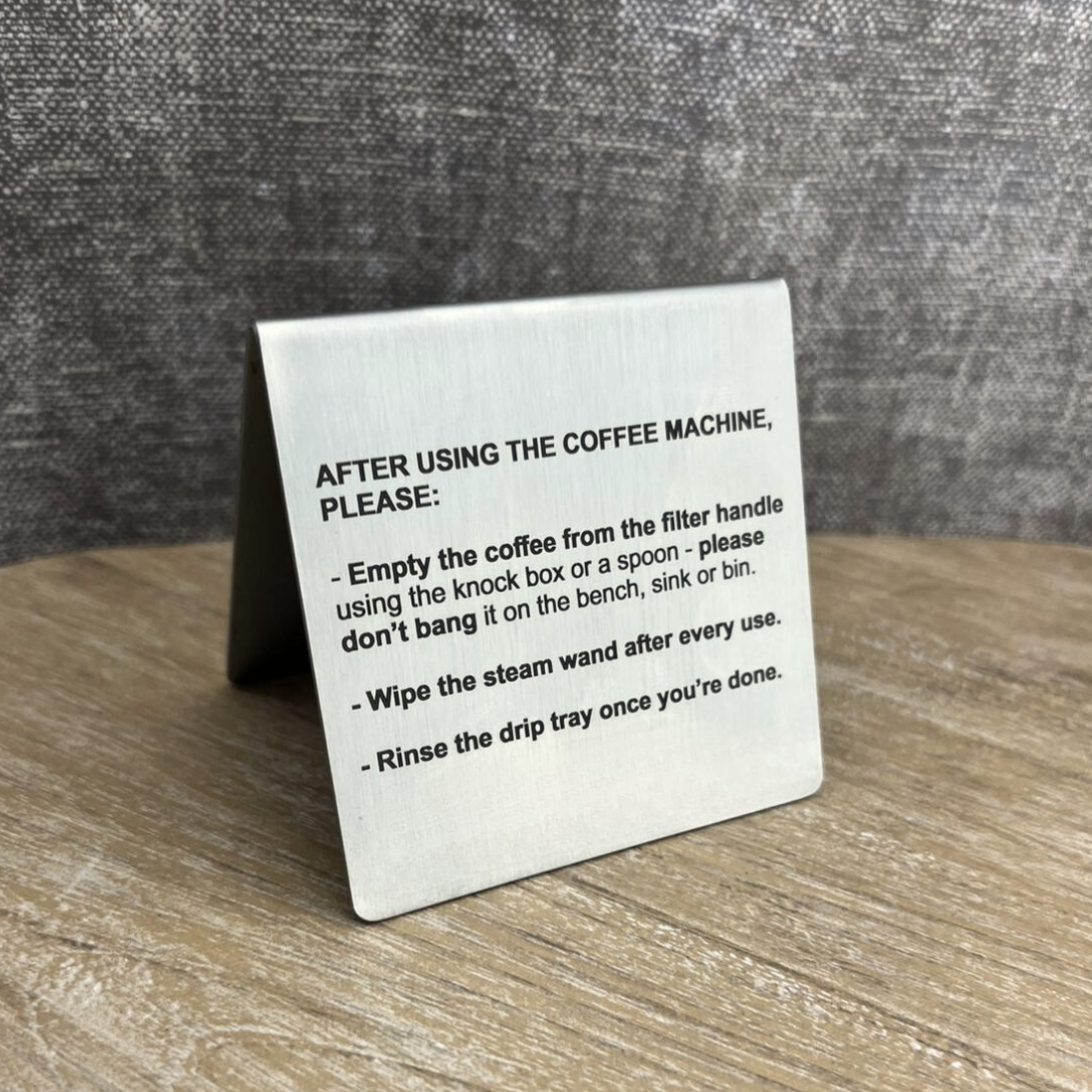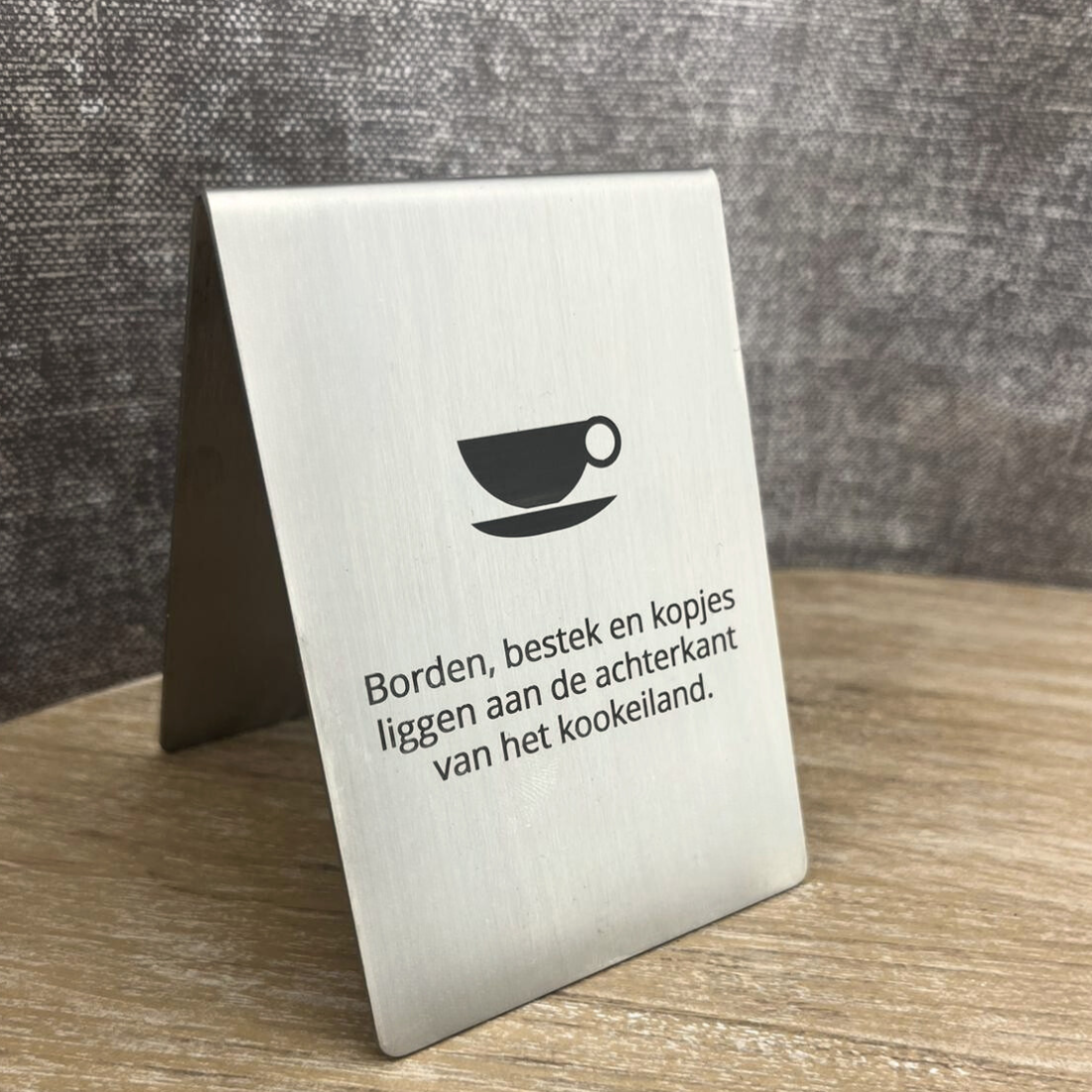 Dit tafelbordje is gemaakt van edelstaal, ook wel RVS genoemd. Het RVS bordje heeft afmetingen van 70 x 70 mm en een dikte van 1 mm. Het bordje kan zowel binnen als buiten worden gebruikt. Bij harde wind raden we echter af om het bordje buiten te plaatsen vanwege het risico dat het weg kan waaien.