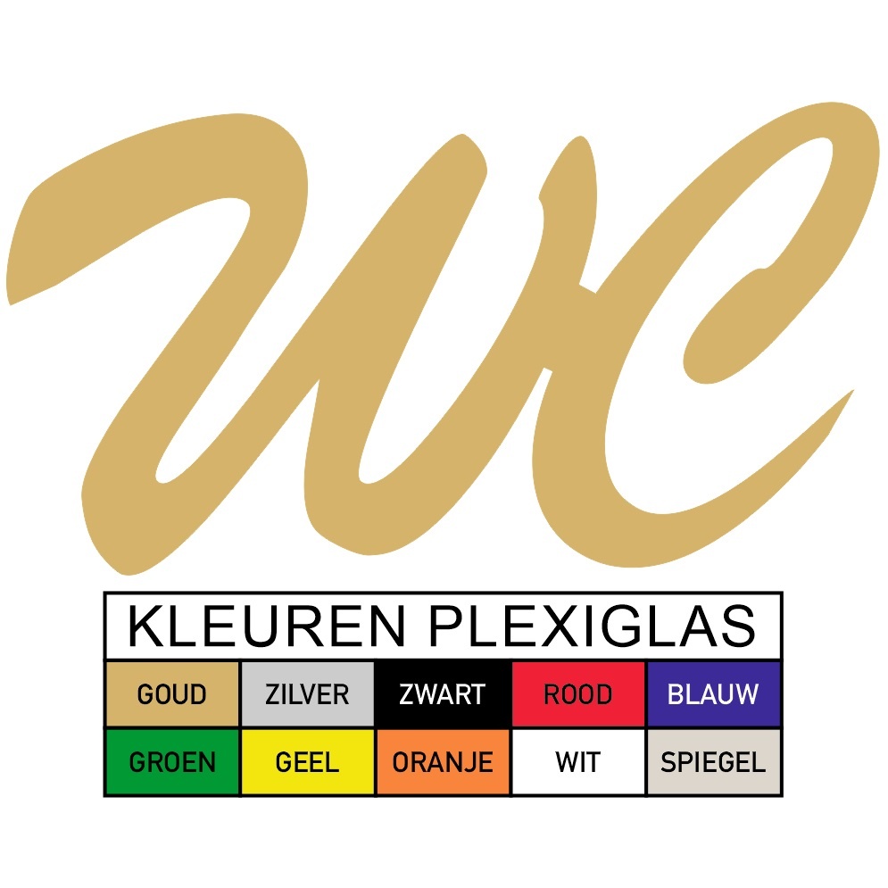 Hier bieden wij als toiletbordje het pictogram "WC" aan, voor gemeenschappelijke toiletten. Het toiletsymbool is volledig uitgesneden in plexiglas eventueel voorzien van Ø3½mm gaatjes of naar wens dubbelzijdig tape. Indien je zelf een ontwerp gemaakt hebt, dan voeren we dat ook graag voor je uit, maar kies daarvoor het eigen ontwerp toiletbordje in plexiglas. Laat wel de maatvoering weten, alsmede het aantal toiletbordjes dat je zou willen bestellen.