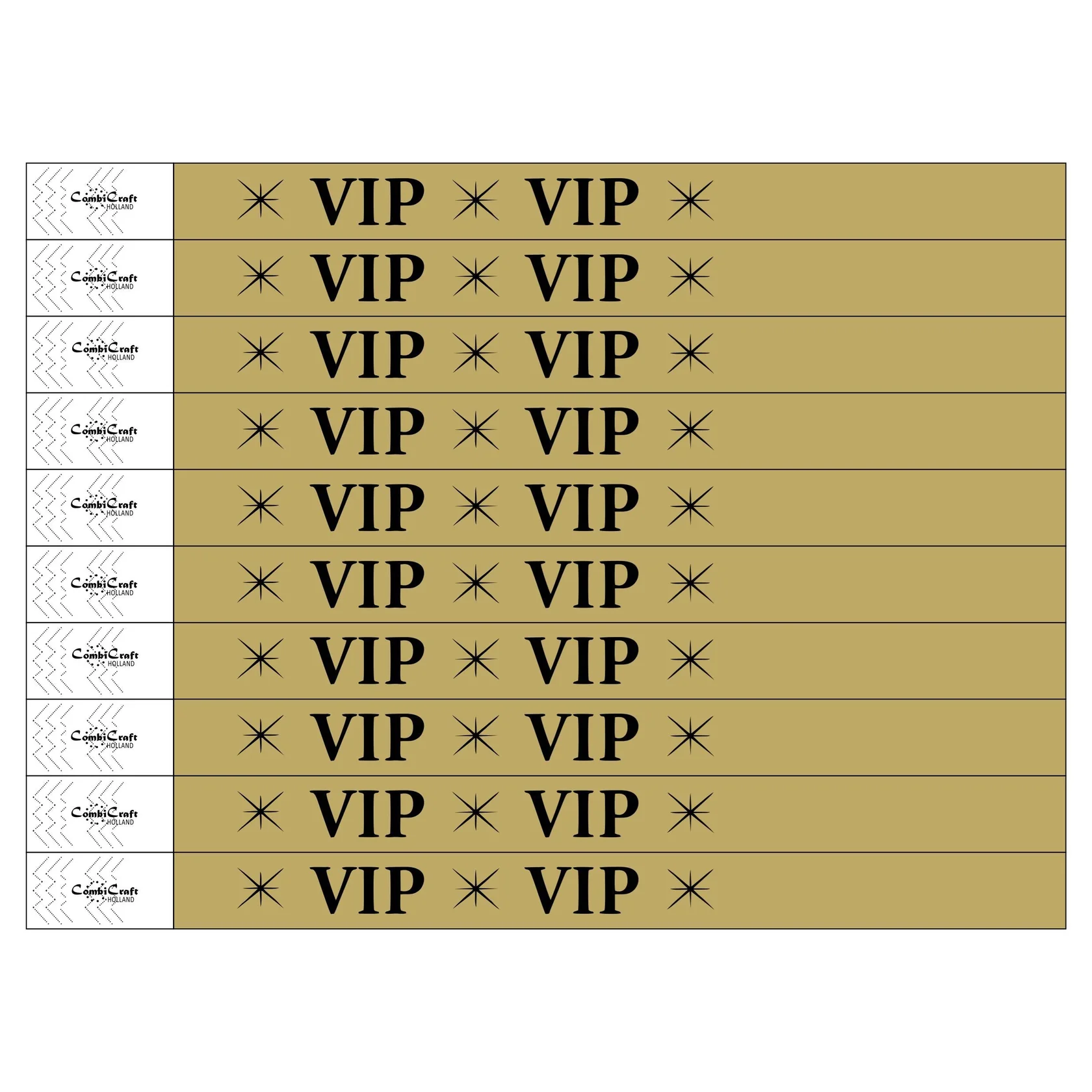 De Tyvek goudkleurige polsbandjes zijn zwart bedrukt de tekst VIP en sterren. Ze hebben afmetingen van 248 x 19 mm en zijn voorzien van een nummering en een sterke plakstrook met veiligheidsbevestiging. Zowel kinderen als volwassenen kunnen deze polsbandjes dragen. De polsbandjes worden geleverd op vellen, waarbij je de bandjes gemakkelijk van elkaar afscheurt. Je ontvangt 10 vellen met op elk vel 10 bandjes. In totaal ontvang 100 polsbandjes. Daarnaast is het mogelijk om de bandjes te beschrijven met een balpen of een watervaste stift.