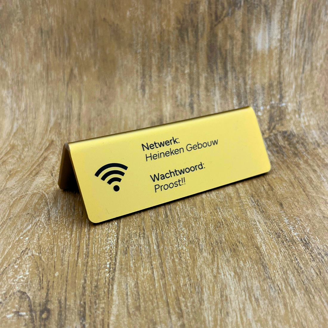 De bedrukking is standaard in het zwart voor een duidelijk contrast met de gouden achtergrond. Je kunt kiezen uit Nederlandse of Engelse tekst. Op het wifi bordje staat het wifi-symbool, zodat ook internationale bezoekers begrijpen waarvoor het bordje dient. Bij het wifi-logo staat de netwerknaam en het wachtwoord van het wifi netwerk, zodat mensen deze gemakkelijk kunnen overnemen om in te loggen op het netwerk.