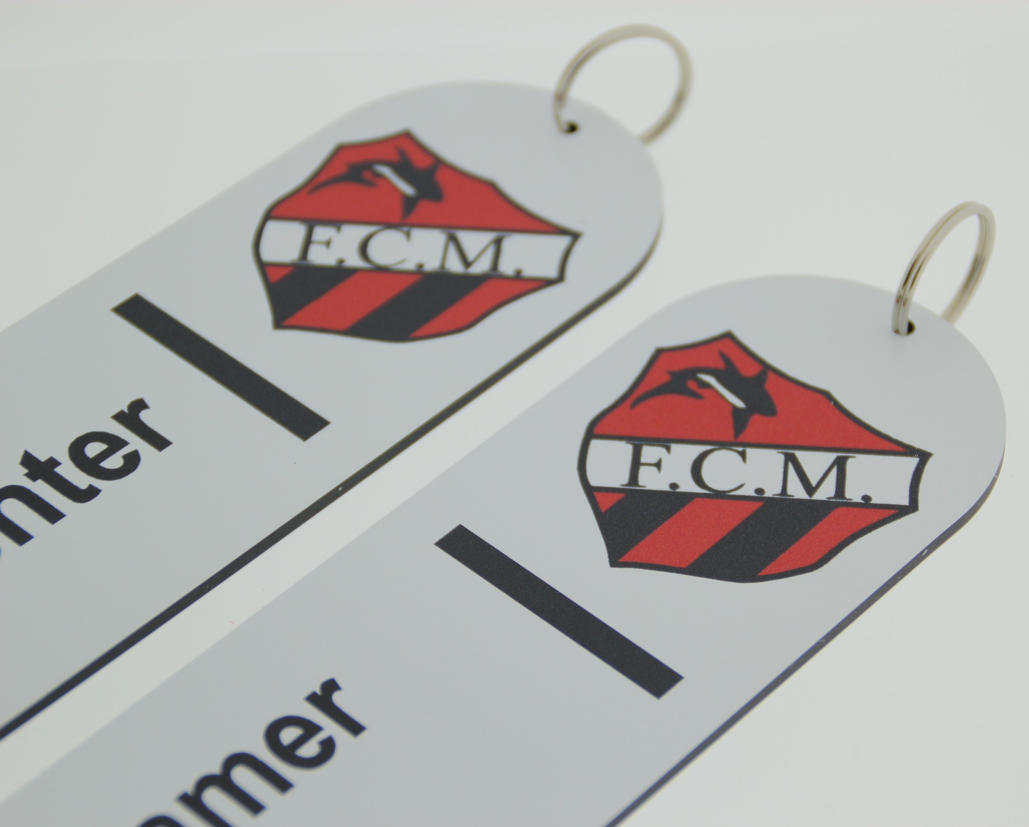 De sleutelhangers zijn gemaakt van Aluminium CombiPanelen in een lengte van 15 centimeter, een breedte van 5 centimeter en een dikte van 3mm. Een CombiPaneel is een sandwich product met twee aluminium buitenzijdes en een kunststof middenlaag. Je kunt dat goed zien op de foto van deze sleutelhanger. Deze middelgrote sleutelhanger XL is ideaal om te bedrukken, niet alleen met teksten, maar ook met logo's en nummers. De opdruk is op één zijde.