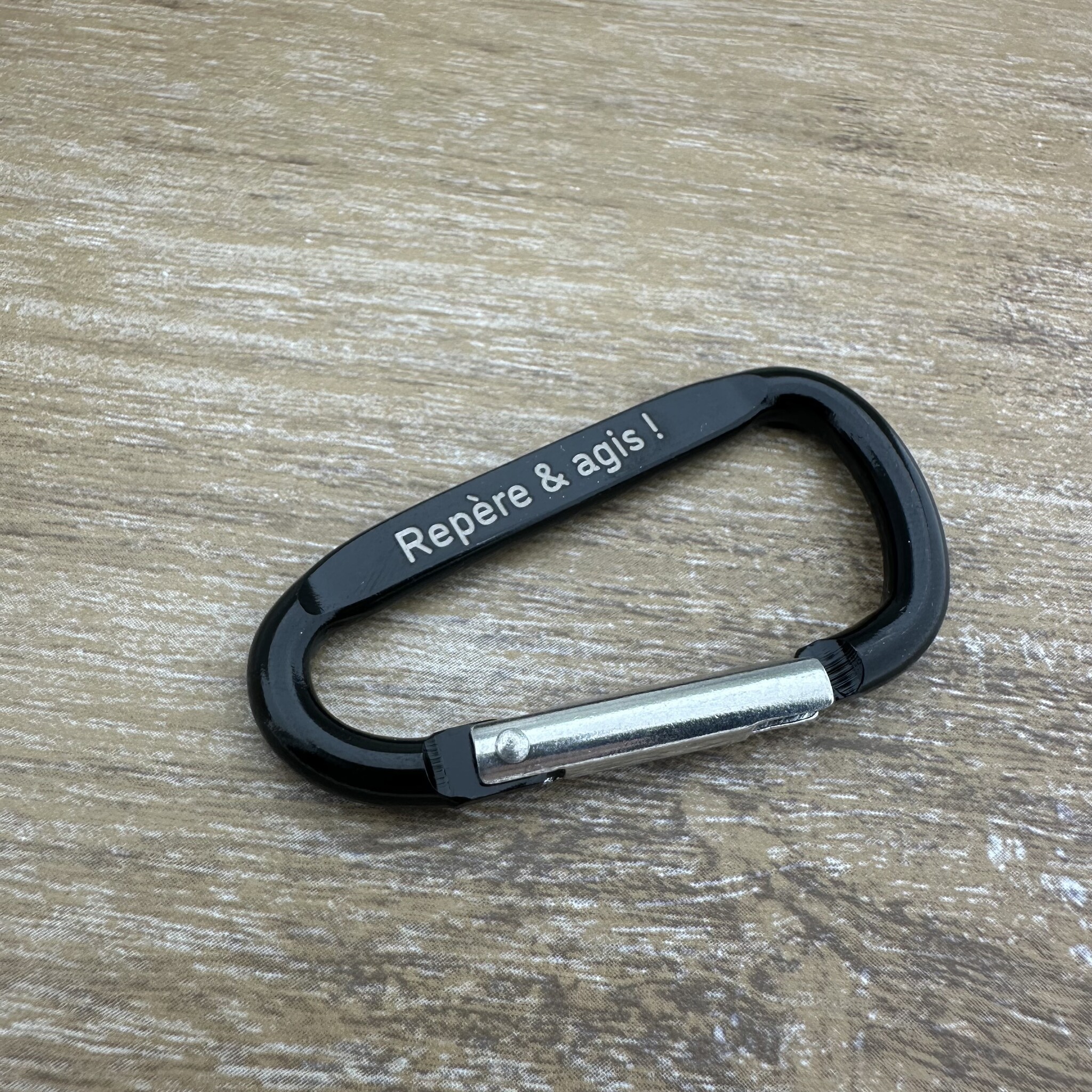 Zwarte karabijnhaak met tekst gravering 60x30mm - per stuk